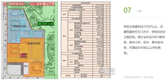 學(xué)校占地面積達(dá)11萬(wàn)㎡以上,總建筑面積約12.5萬(wàn)㎡,學(xué)校擬共分三期開(kāi)發(fā)。預(yù)計(jì)會(huì)開(kāi)設(shè)108個(gè)教學(xué)班,其中小學(xué)、初中、高中各36班,可滿足4200名以上學(xué)生就讀。