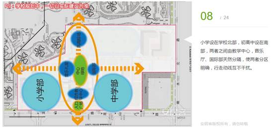 小學(xué)設(shè)在學(xué)校北部,初高中設(shè)在南部,兩者之間由教學(xué)中心,音樂(lè)廳、國(guó)際部天然分隔,使兩者分區(qū)明確,行走動(dòng)線互不干擾。