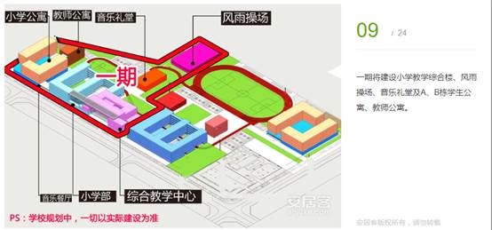 一期將建設(shè)小學(xué)教學(xué)綜合樓、風(fēng)雨操場(chǎng)、音樂(lè)禮堂及A、B棟學(xué)生公寓、教師公寓。