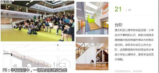 澳大利亞心理專家實(shí)驗(yàn)證明:小學(xué)生對(duì)于事物的認(rèn)識(shí)、辨別與選擇多是根據(jù)對(duì)視覺(jué)有強(qiáng)烈感染力的色彩進(jìn)行的。該校多處設(shè)立公共大臺(tái)階,運(yùn)用鮮艷色彩和材質(zhì)出充分考慮小學(xué)生心理特點(diǎn),激發(fā)學(xué)生的藝術(shù)細(xì)胞。